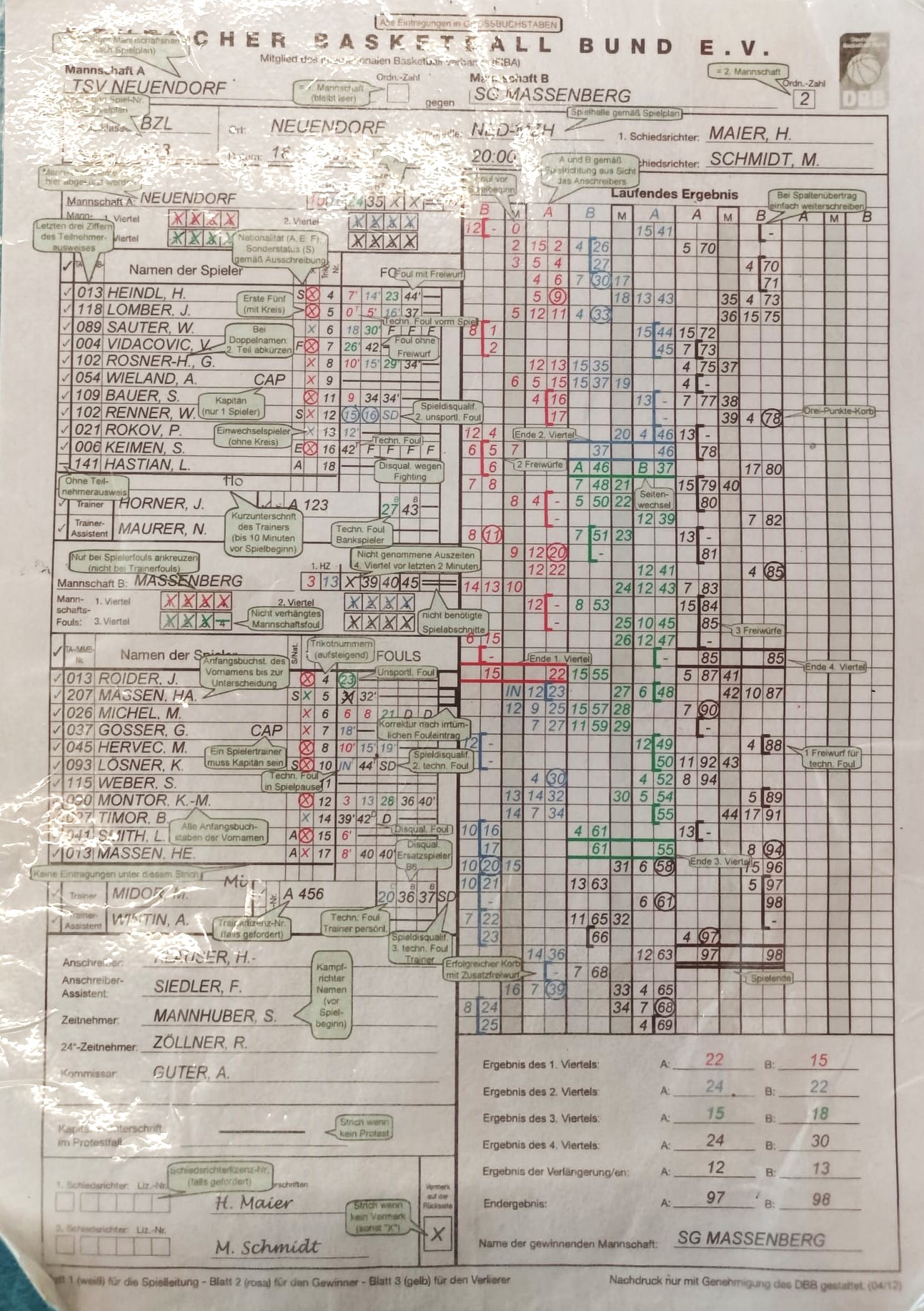 Ein Anschreiber beim Basketball ist eine Person, die während eines Spiels bestimmte statistische Informationen protokolliert. Dazu gehören beispielsweise die Namen der Spieler, ihre Trikotnummern, Punkte und Fouls. Der Anschreiber arbeitet eng mit dem Schiedsrichter und dem Zeitnehmer zusammen, um sicherzustellen, dass alle Spielstatistiken korrekt erfasst werden. Seit dieser Saison gibt es dien Spielberichtsbogen auch digital. Mehr zum digitalen Spielberichtsbogen (DSBB) erfahrt ihr unten.
